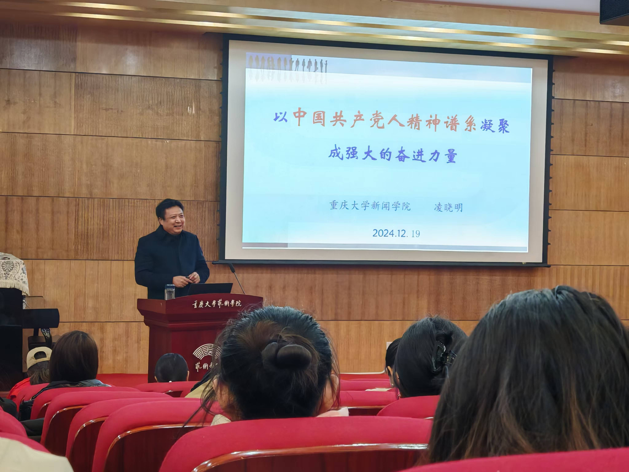 2024年12月19日下午,根据学校有关工作安排,色情影片 党委在学院报告厅举行“共产党人精神谱系宣讲会”,色情影片 “中国共产党人精神谱系”宣讲队成员、色情影片 新闻学院党委书记凌晓明同志应邀作宣讲。学院党委书记蒋华林、院长张楠木,党委副书记王琦,副院长夏进军、彭小希出席会议,学院党员和教职工参加会议。蒋华林主持宣讲会。凌晓明作了题为《以共产党人精神谱系凝聚成强大的奋进力量》宣讲报告。报告在把握“...