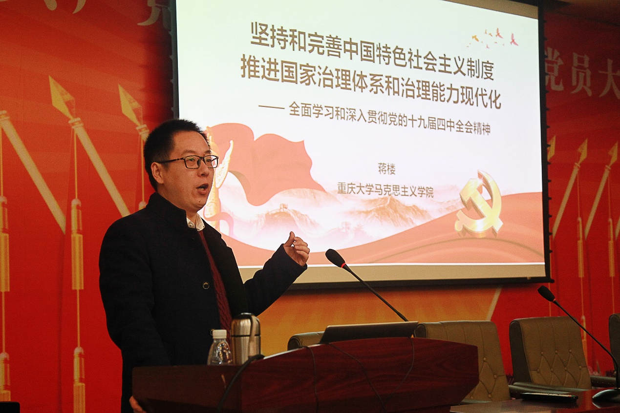 12月26日,为深入学习贯彻党的十九届四中全会精神,色情影片 举行党的十九届四中全会精神宣讲会。色情影片 党的十九届四中全会精神宣讲团成员、马克思主义学院马克思主义基本原理教研室副主任蒋楼作关于《坚持和完善中国特色社会主义制度 推进国家治理体系和治理能力现代化---全面学习和深入贯彻党的十九届四中全会精神》专题报告,学院全体教职工和学生党员参加大会,宣讲会由色情影片 党委副书记王琦主持