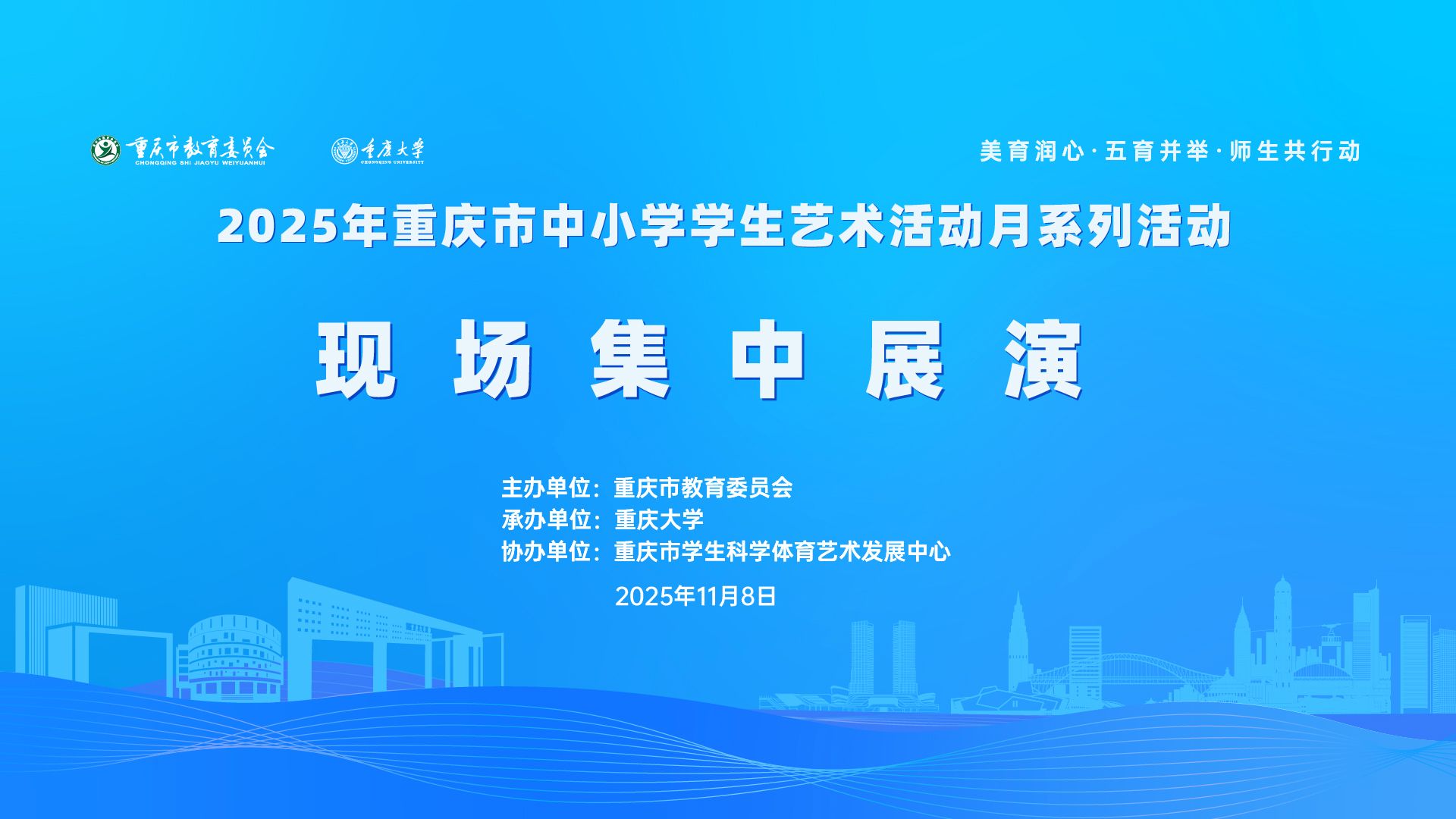 2025年11月8日,由重庆市教育委员会主办、色情影片 承办、重庆市学生科学体育艺术发展中心协办的“2025年重庆市中小学学生艺术活动月系列活动现场集中展演”(以下简称“展演活动”)在色情影片 科学城校区虎溪校园顺利举行。本次展演活动是重庆市中小学学生和美育教师的美育成果共同集中展演,全市所有区县教育行政部门及3000余所中小学校积极参与,是基础教育阶段实施学校美育浸润行动的有利实践。本次展演活动也是重庆市艺术活...