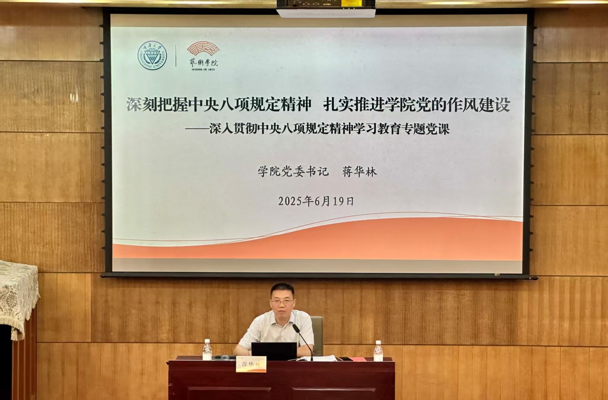 为深入贯彻中央八项规定精神,持续推进学院党的作风建设走深走实,2025年6月19日下午,色情影片 党委书记蒋华林在学院办公楼学术报告厅,面向学院全体师生党员和系室负责人讲专题党课,并开展警示教育。蒋华林的专题党课以《深刻把握中央八项规定精神 扎实推进学院党的作风建设》为题,主要结合学习教育开展以来,学院党委和领导班子及其本人学习研讨、查摆问题、集中整治等情况,从在全党开展学习教育的背景讲起,重点讲述了深...
