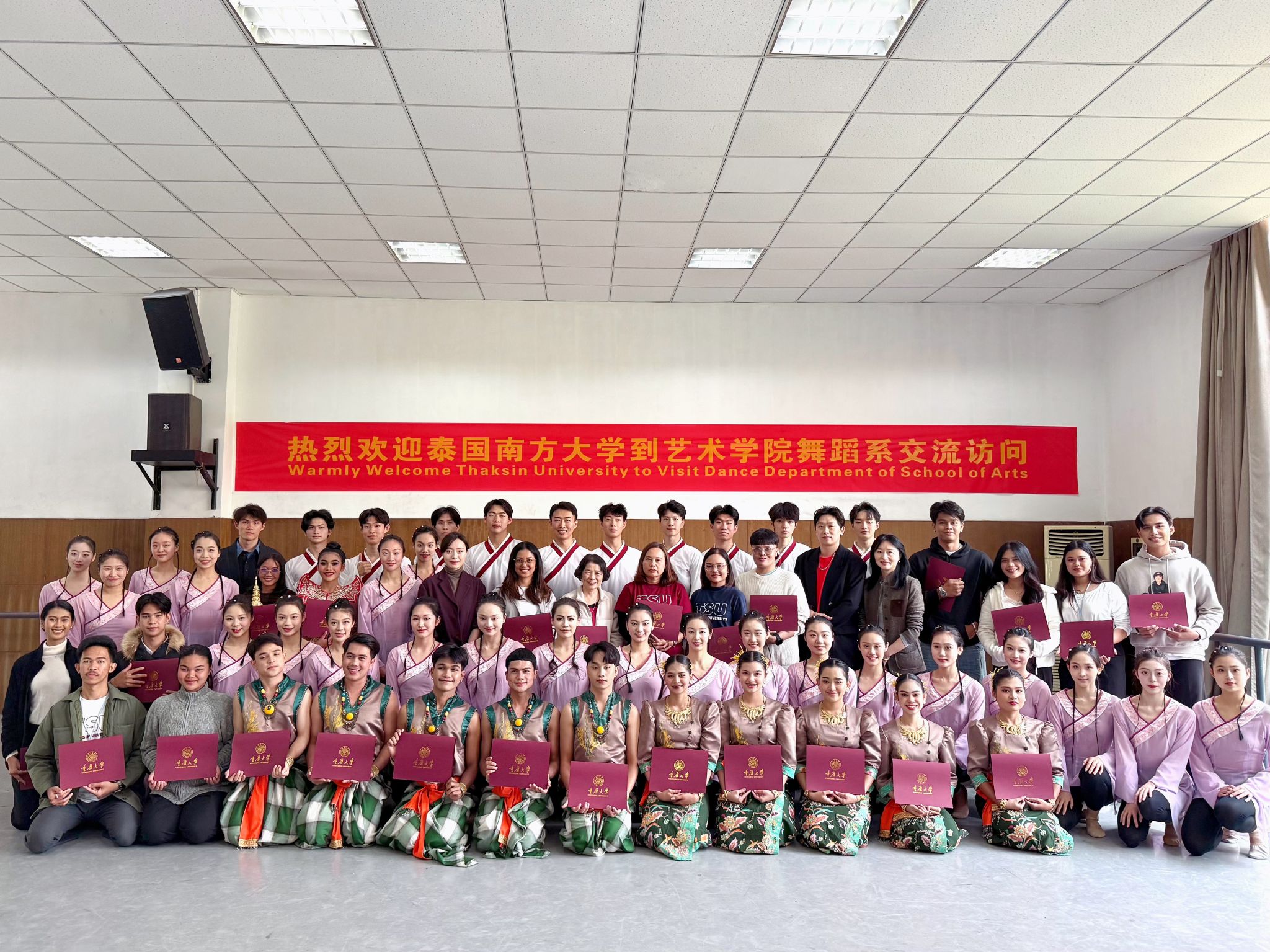 2025年4月2日至4月3日,泰国南方大学(Thaksin University)学生事务副校长Miss Siraya Sitthisarn率师生交流团(含5名教师、22名学生)访问色情影片 ,与我院师生开展了为期两天的文化艺术交流活动,并通过互学互演促进了两国传统舞蹈的跨文化交流与互鉴。首日交流:互学传统艺术4月2日,两校师生展开艺术实践交流。泰国南方大学学生首先展示了泰式传统舞蹈服饰的文化特色,并邀请色情影片 学生试穿体验。随后,泰方学生...
