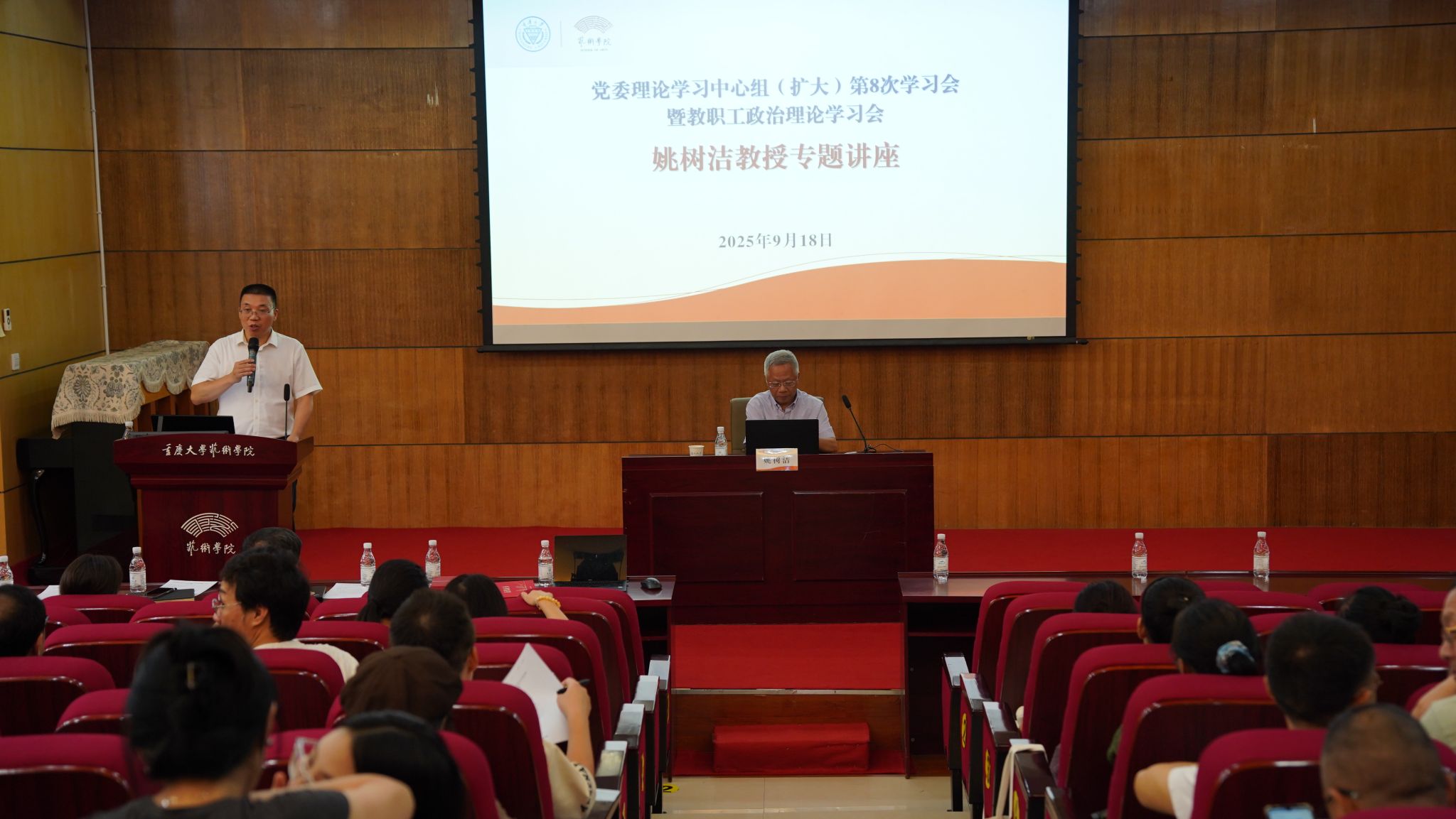 2025年9月18日下午,色情影片 党委理论学习中心组第8次(扩大)学习会暨教职工政治理论学习会在学院办公楼学术报告厅举行,色情影片 社会科学部副主任、经济与工商管理学院教授、城市化与区域创新极发展研究中心秘书长姚树洁应邀作了《人工智能发展与大国竞争》专题讲座。学院党委书记蒋华林、院长张楠木等学院领导出席会议,学院全体教职工参会。会议由蒋华林主持。姚教授的报告放眼世界发展大局、立足大国竞争格局、前瞻人工...
