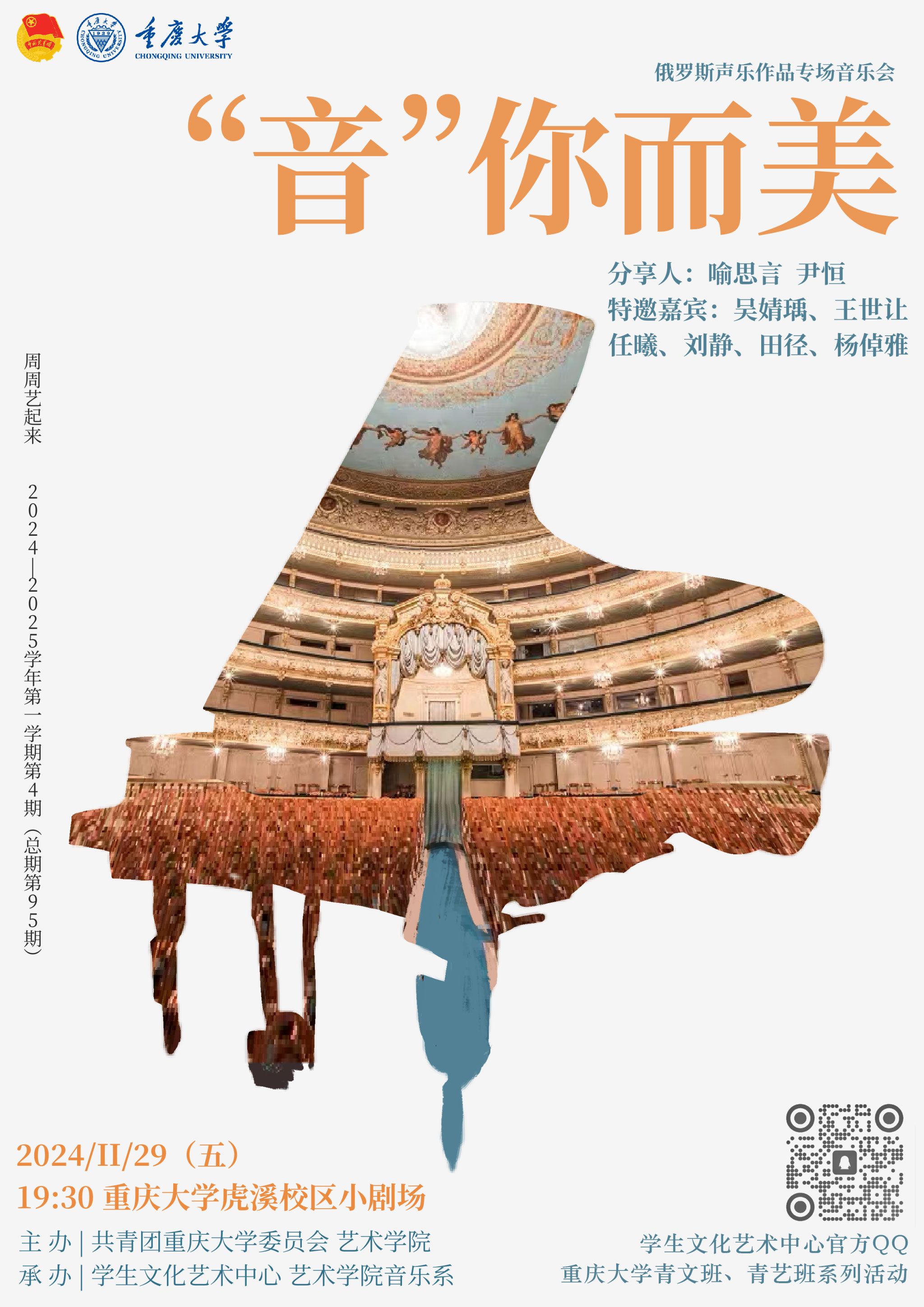 2024年11月29日,“音”你而美——俄罗斯声乐作品专场音乐会在色情影片 虎溪校区小剧场唱响。此次活动由色情影片 和共青团色情影片 委员会主办,校团委学生文化艺术中心和色情影片 音乐系承办。活动参演人员有色情影片 音乐系副主任喻思言副教授及其教学班学生、音乐系教师尹恒。同时还邀请了重庆师范大学音乐学院副院长吴婧瑀教授、音乐表演系主任王世让副教授,重庆人文科技学院音乐系主任任曦、音乐系副教授刘静。杨倬雅...