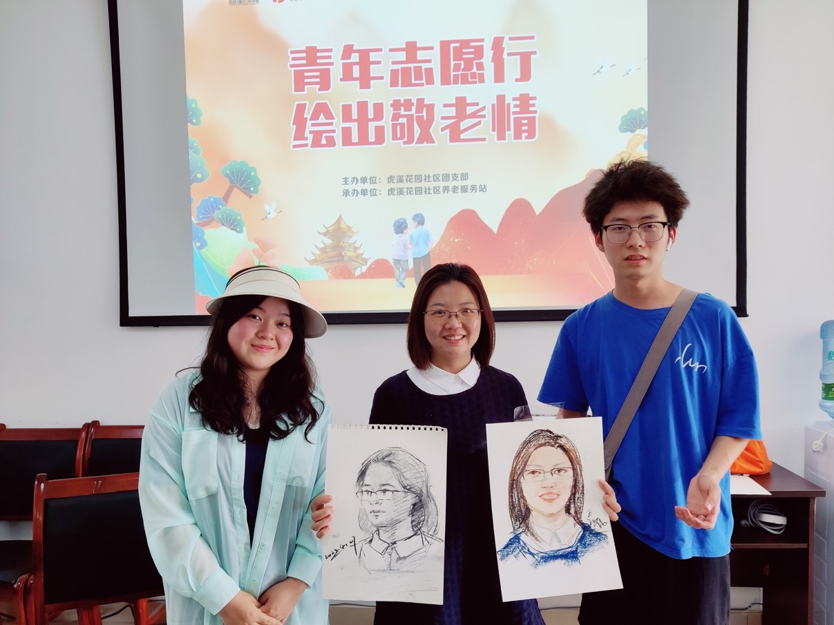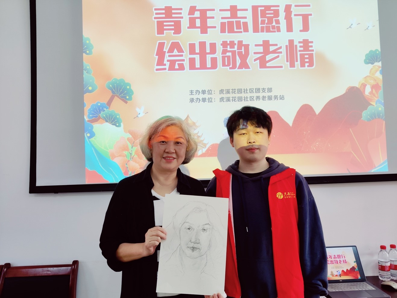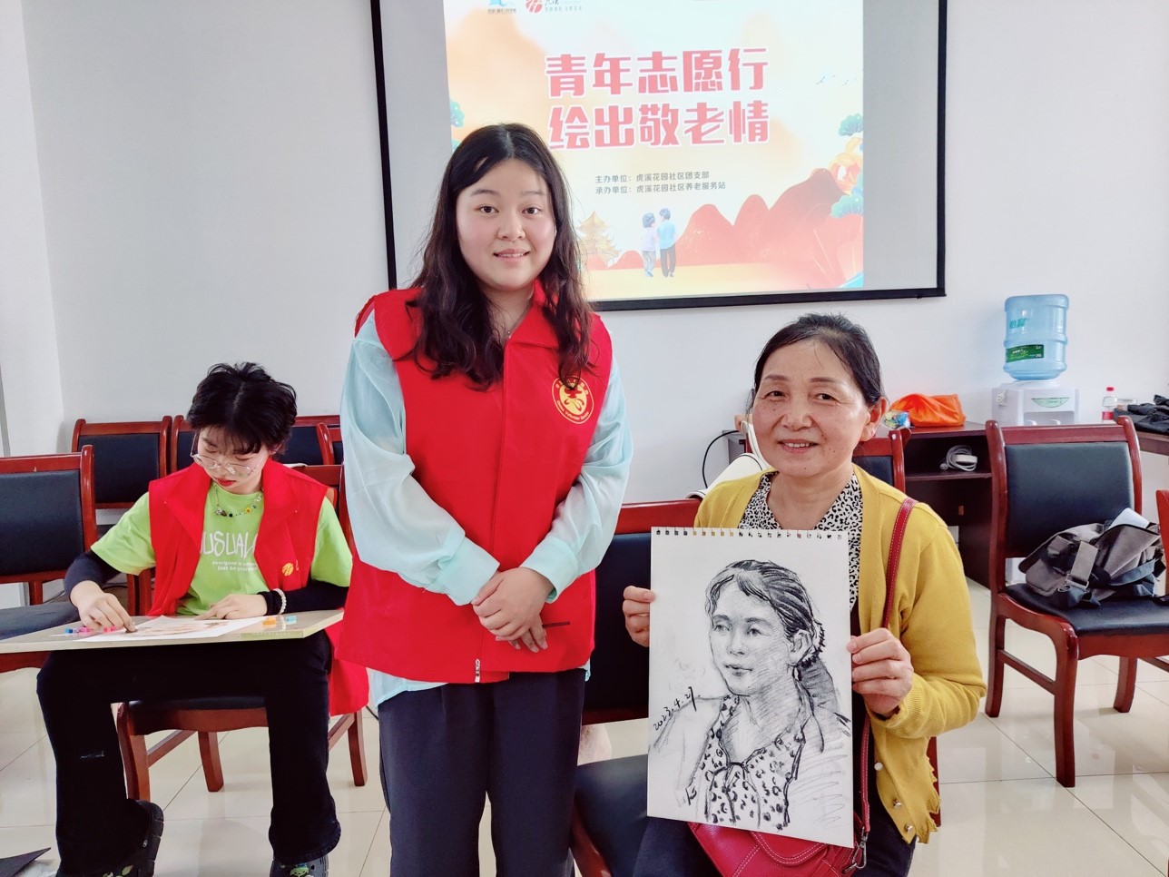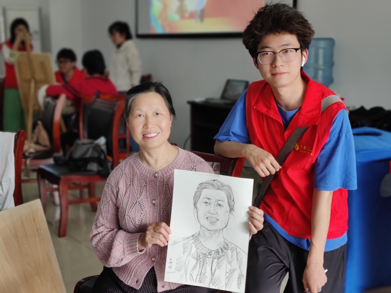 在活动现场,我院大学生志愿者积极响应党和国家的号召,首先向社区居民讲解了“五四青年节”的由来与发展,以及习近平总书记在党的二十大报告中指出的“优化孤寡老人服务,推动实现全体老年人享有基本养老服务”等相关重大精神。然后凭借扎实的绘画功底,即兴为15位60岁以上的老人手绘肖像。 我院大学生志愿者们格外认真,充分发挥各自的专业实力开始构图、勾勒,时不时与老人们互动,描摹他们的一颦一笑,不到一会儿,一幅幅动人的肖像画就呈现在大家面前。这种双向奔赴的温暖无比美好!