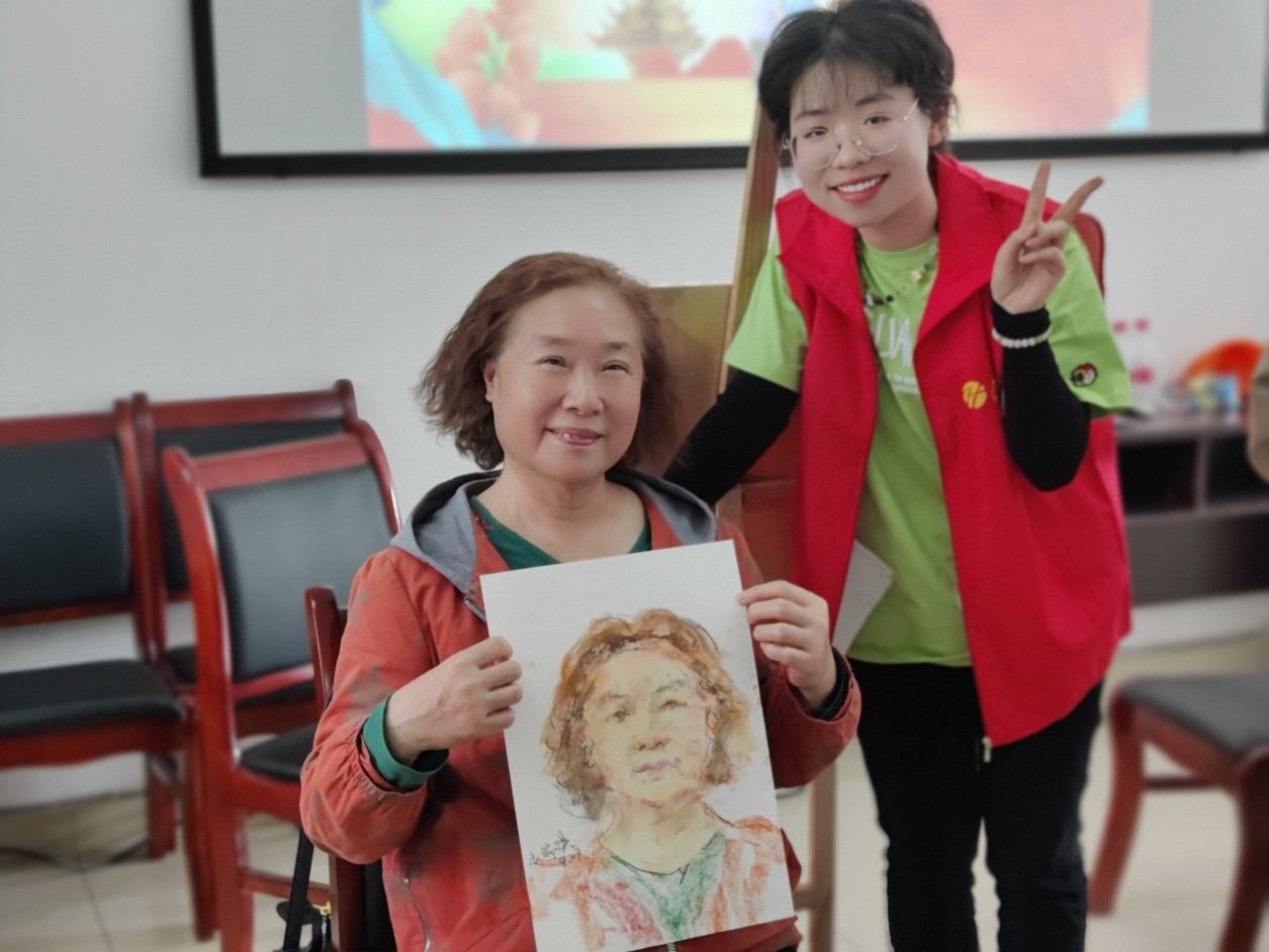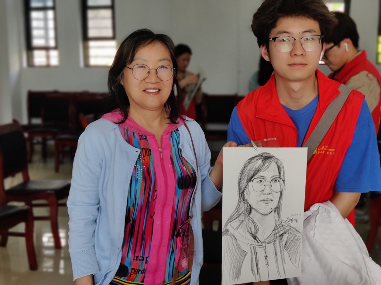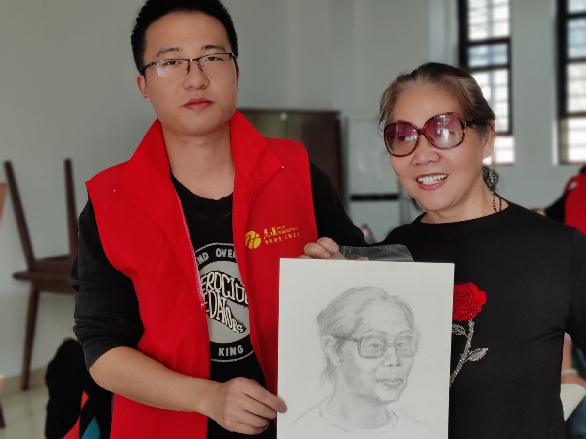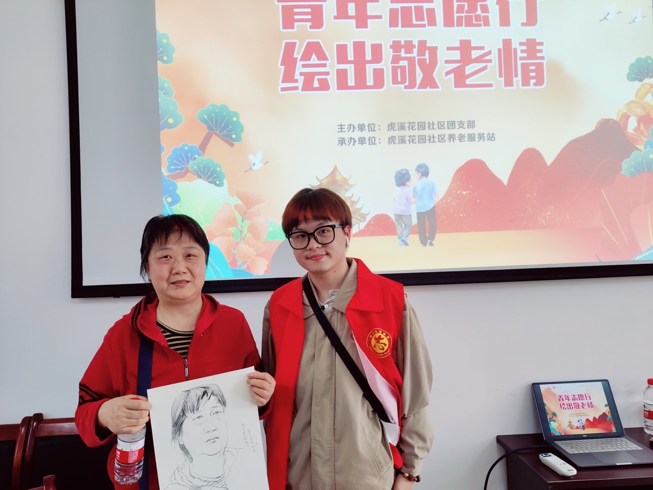 在活动现场,我院大学生志愿者积极响应党和国家的号召,首先向社区居民讲解了“五四青年节”的由来与发展,以及习近平总书记在党的二十大报告中指出的“优化孤寡老人服务,推动实现全体老年人享有基本养老服务”等相关重大精神。然后凭借扎实的绘画功底,即兴为15位60岁以上的老人手绘肖像。 我院大学生志愿者们格外认真,充分发挥各自的专业实力开始构图、勾勒,时不时与老人们互动,描摹他们的一颦一笑,不到一会儿,一幅幅动人的肖像画就呈现在大家面前。这种双向奔赴的温暖无比美好!