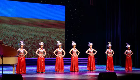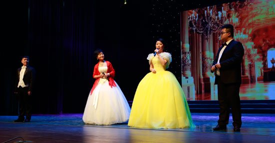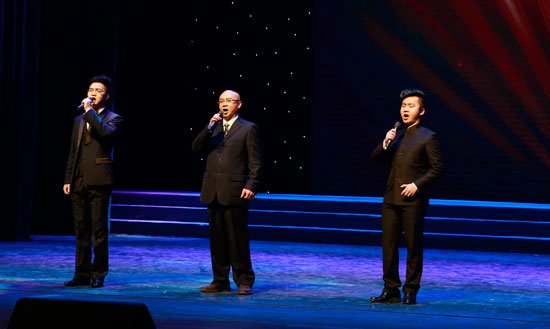 晚会在舞蹈系群舞《鼓舞相合》和音乐系混声四部合唱《请把我的奶名叫》、《弹起我心爱的土琵琶》歌舞声中拉开了序幕。音乐系大四学生杨炉磊一曲《我的父亲》,用歌声演绎了人类永恒的父子深情,研三学生车翔用载歌载舞的独唱《吐鲁番的姑娘》给我们带了不一样的新疆风情,陈燕老师独唱《春天的芭蕾》让我们在隆冬时节感受到春的美好和希望,喻思言老师演唱的威尔第歌剧《唐.卡洛》选段《卡洛.听我说》仿佛带我们穿越时空去到了19世纪的意大利。经典的现代风格无伴奏人声合唱《Lydia》和男女生表演唱《The Boys》让我们看到了一群热爱艺术,勇于探索新艺术的90后男孩女孩的时尚青春气息。女生表演唱《赶秋》、《孔雀飞来》和群舞《那座秀山那片情》将我们带入土家族和傣族村寨,曼妙的舞姿、优美的歌声以及动人的传说,田野气息迎面扑来,赏心悦目。舞蹈系男子群舞《巴蜀战歌》向我们展示出了巴渝大地沉雄有力、顽强勇敢的男子汉气魄。由国家一级演员、音乐系张礼仁教授领衔的男生三重唱《信仰》、青年教师喻思言领衔的歌剧片段《让我们携手同行》和学生表演的《共青团》之歌奏响了时代主旋律,振奋人心,现场观众不由自主全场同唱,台上台下沉浸在歌声的海洋中。音乐系程云莲老师和学生阮响琳二重唱《炫境》将全场观众带入了音乐的炫境和对新年憧憬的炫境中。最后在苏勤、秦勤二位老师和学生们同唱的《饮酒歌》中,“让我们高举起欢乐的,胜利的酒杯”,庆祝2015年胜利结束,2016年欢乐美好的到来,为晚会画上了完美的音符。