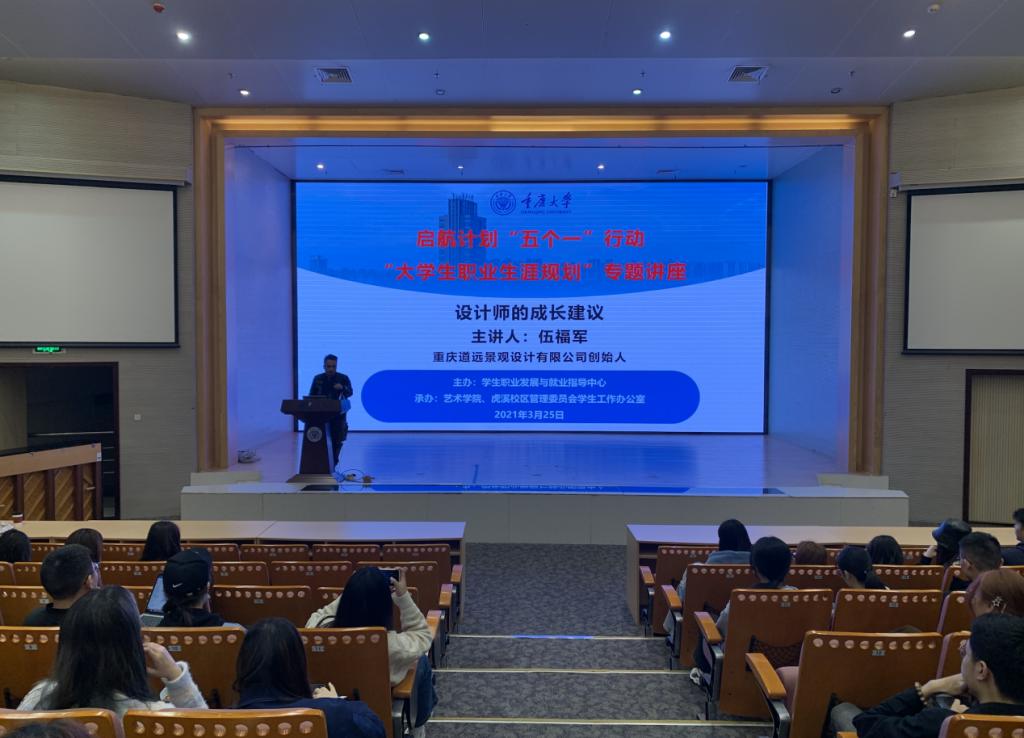 、虎溪校区管理委员会学生工作办公室承办,主讲人为我院01级校友,重庆道远景观设计有限公司创始人伍福军,主题是“设计师的成长建议”。学院党委副书记王琦、辅导员余华君、杨传国老师参加此次讲座。