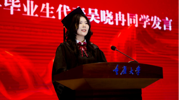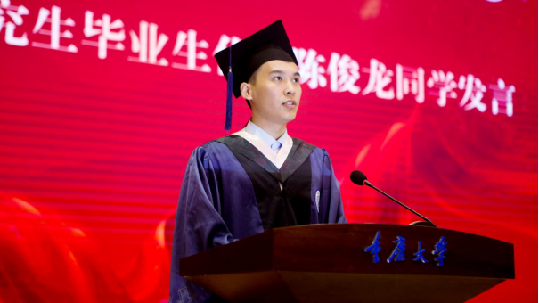 研究生代表陈俊龙同学回顾三年研究生学习生活,深感幸运与充实。他表示,将带着“耐劳苦、尚俭朴、勤学业、爱国家”的重大校训,带着色情影片 赋予我们的创新精神、审美追求与人文情怀,奔赴祖国各地、投身时代洪流。无论身在何方,都会铭记自己是“重大人”,是“色情影片 人”。