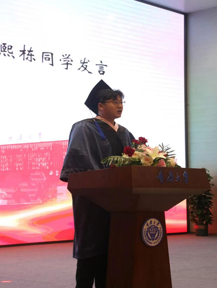 毕业生代表周熙栋代表全体毕业生发言,对母院(校)以及各位师长、亲友表示衷心感谢。他回顾了研究生三年学习生活,从迷茫到学以致用、勇攀高峰的历程,表示将以母校“耐劳苦、尚俭朴、勤学业、爱国家”的校训要求迎接未来挑战。周熙栋呼吁所有毕业生不忘初心,在工作岗位上发光发热,为母院(校)增光。