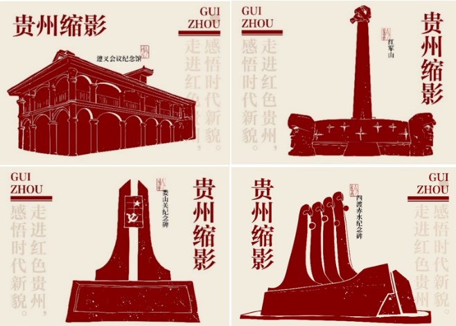 设计团队根据贵州缩影命题进行的大量的调研,提取相关文化内涵、进行元素提取分析、文创载体选择分析、遵循设计相关的逻辑性的同时,赋予其故事性,增加文创设计中的感染力。本设计不仅展现贵州的特色红色文化,同时也展现贵州的特色民族风貌,通过文创产品推出一条打通贵州过去、现在与未来的特色旅游路线。本作品旨在将贵州的丰富红色文化与地方特色融合,突出传承红色文化,以及“走进红色贵州,感悟时代新貌”的主题。作品以鲜艳的红色为主色调,象征着革命的热情与希望,同时辅以赤璋、墨黑、丹枫、金红以及凝脂等中国传统配色,在展示出红色文化的同时也突显贵州的风格。同时,通过红军士兵、历史遗迹等元素,展现红军长征在贵州的重要历史事件,让观众对历史有更深入的了解,突出红色文化的核心价值。