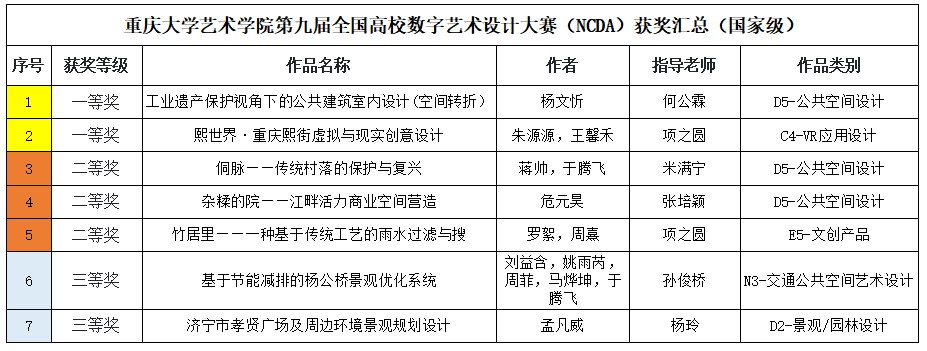 我院设计学系于2021年5月建立NCDA大赛咨询群,帮助同学了解大赛各项事宜,同学们热情高昂,积极准备作品创作。经过老师严谨认真的指导,同学们努力修改和完善作品细节,作品整体效果也更加的和谐和切题,之后经由学生自主申报、院内评委老师评选,最终从投稿的67份作品中选取55份作品进入到重庆市赛区。2021年8月19日,经过评委精心评选,重庆赛区评奖结果出炉,我院设计学系获得一等奖10份、二等奖4份、三等奖11份,共计25份等级奖作品。2021年8月31日,全国总决赛评审工作也全部结束,获奖作品揭晓,设计学系有7份作品斩获各级奖项,其中一等奖2份、二等奖3份、三等奖2份。