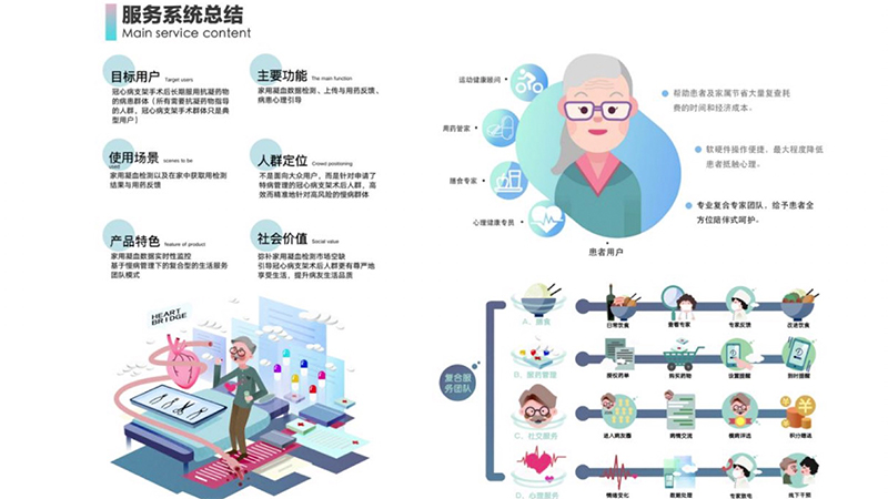 工业设计中心团队与生物工程学院合作设计研发,服务设计的部分主要由彭科星老师指导,我院研究生赵德胜、杨宇辰、王梦雅与任绍阳共同合作完成,该服务系统主要针对心血管疾病患者的日常凝血检测管理,设计初期主要融入了民主化设计与无障碍化的理念,在硬件方面,团队不断迭代方案,尽可能地降低产品外观带来的非必要的生产成本提高,在保证凝血检测质量的前提下降低硬件成本,能够让更多的心血管疾病患者较低成本的获取产品与服务,考虑到中国有上千万心血管疾病患者,因此针对这类人群的设计,必须要让设计更接地气,更具有民主性。这也是设计师必须承担的社会责任,也正是这份担当精神,不断驱动着团队一次又一次的对系统和各个要素进行升级。