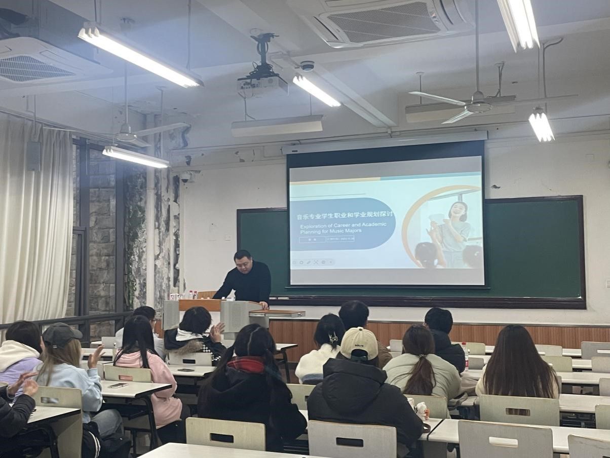 数字媒体与动画系教师。他的分享主题为《音乐专业学生的学业规划和职业规划》,向同学们分析了综合性大学音乐专业的特色与优势,并强调了学业与职业规划的重要性。通过对专业学习方法的指导以及对职业规划不同层面的剖析,同学们更加明确了自身的职业定位。