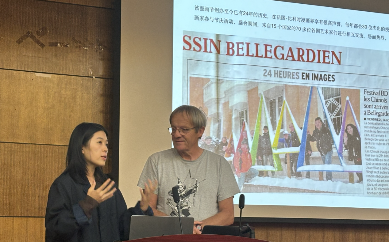 米歇尔•苏侯先生详细介绍了法国贝勒加德漫画节的历史与现况。他表达了对中国艺术家的欣赏和认同,并欢迎大家前往法国参加漫画节盛会,对同学们发出了诚挚热情的邀请。