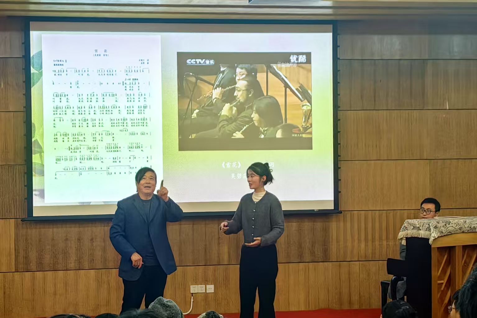讲座中的实践教学环节,音乐系两名师生袁筱璇、胡文瑾及嘉宾冯丽媛上台演唱孟勇的代表作《雪花》《我的好妈妈》《瑶族舞曲》,共同探讨对作品背景的理解及演唱情感处理与表达,师生们在音乐演绎方面有了很大的感悟和提高。