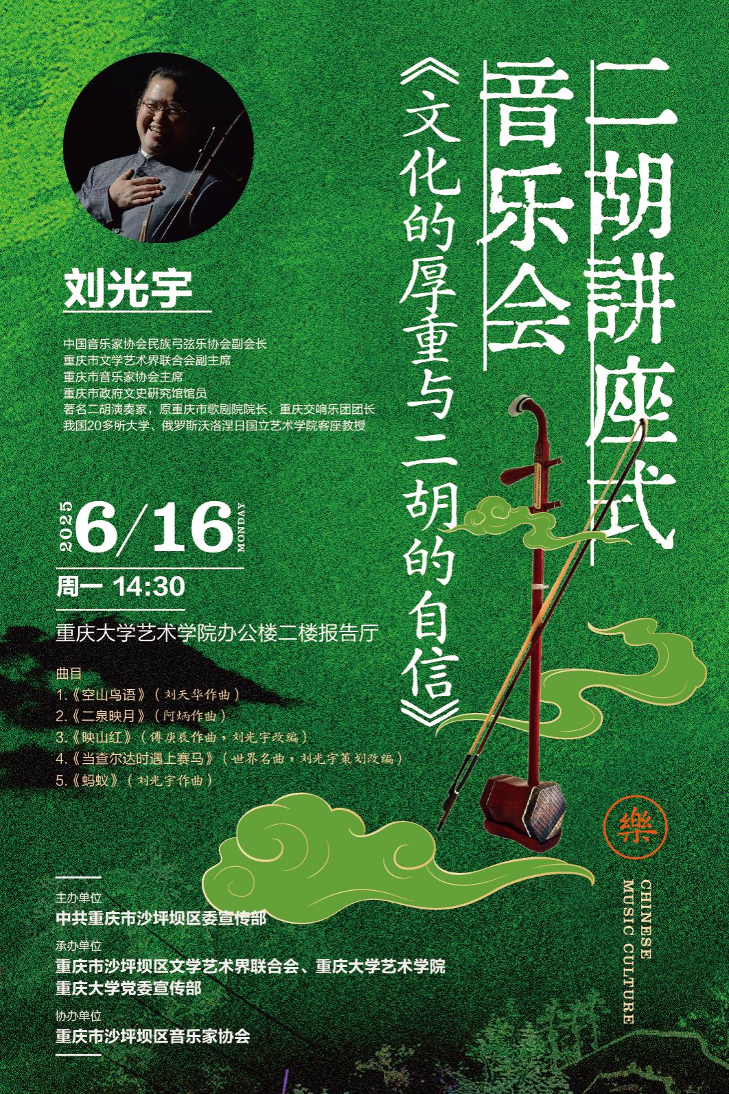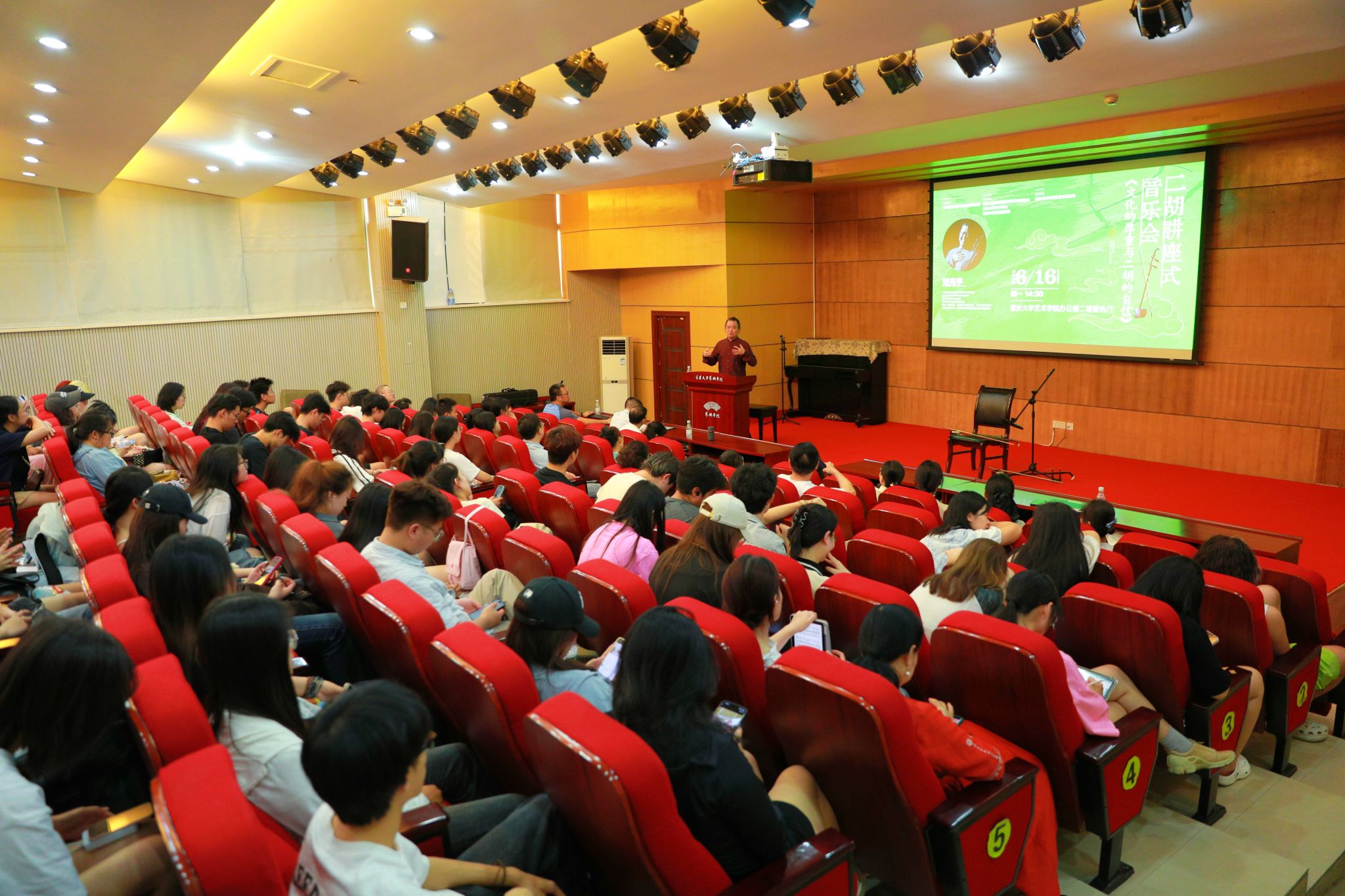 刘光宇系中国音乐家协会民族弓弦乐协会副会长,重庆市政府文史研究馆馆员 ,著名二胡演奏家 ,重庆市歌剧院原院长、重庆交响乐团原团长。同时,担任我国 20 多所大学、俄罗斯沃洛涅日国立色情影片 等高校客座教授。音乐会现场,刘光宇以“文化的厚重与二胡的自信”为主题,通过对作品《空山鸟语》(刘天华作曲)、《二泉映月》(阿炳作曲)、《映山红》(傅庚辰作曲、刘光宇改编)、《当查尔达时遇上赛马》(卞留念作曲、刘光宇策划)、《蚂蚁》(刘光宇作曲)的讲解和诠释,将中华文化和二胡艺术的厚重性和当代性,以时间为链条,以乐曲为故事呈现给现场观众。一场别开生面的二胡讲座式音乐会为师生们带来了一场视听与文化交融的盛宴!