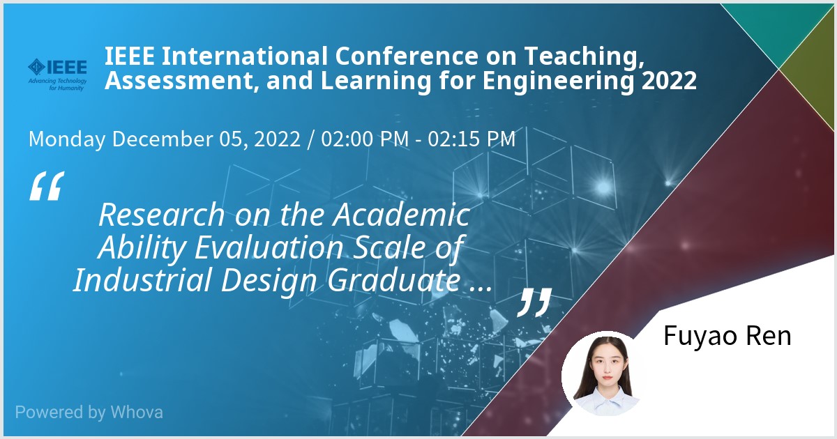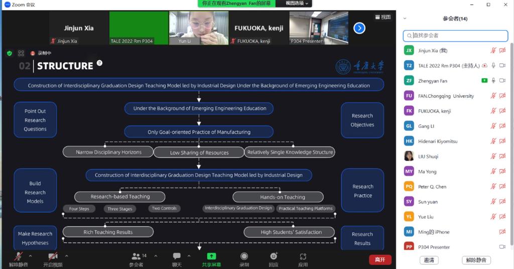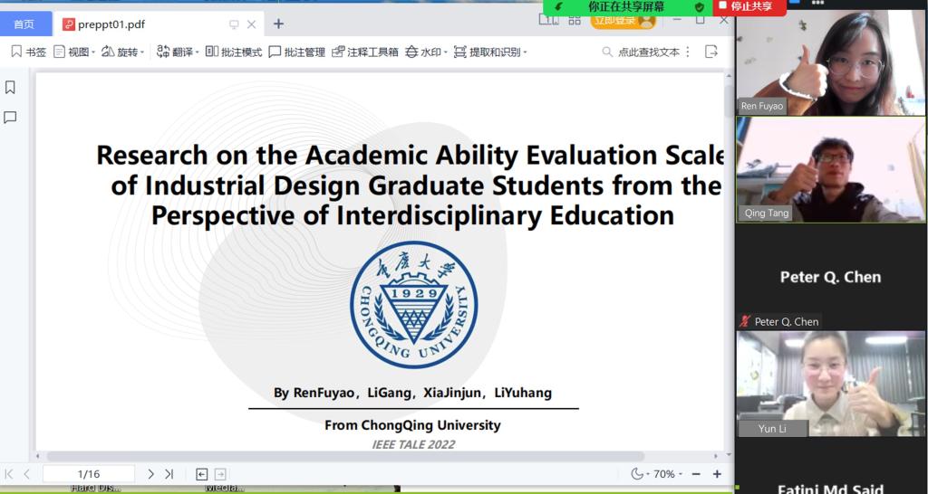 2022年12月5日,我院设计学系范正妍副教授、李刚副教授和夏进军副教授带领研究生团队参加IEEE TALE 2022国际学术论坛并与会进行了三场论文汇报,设计学研究生任符瑶、李赟、唐庆同学分别代表团队在线进行了分享。