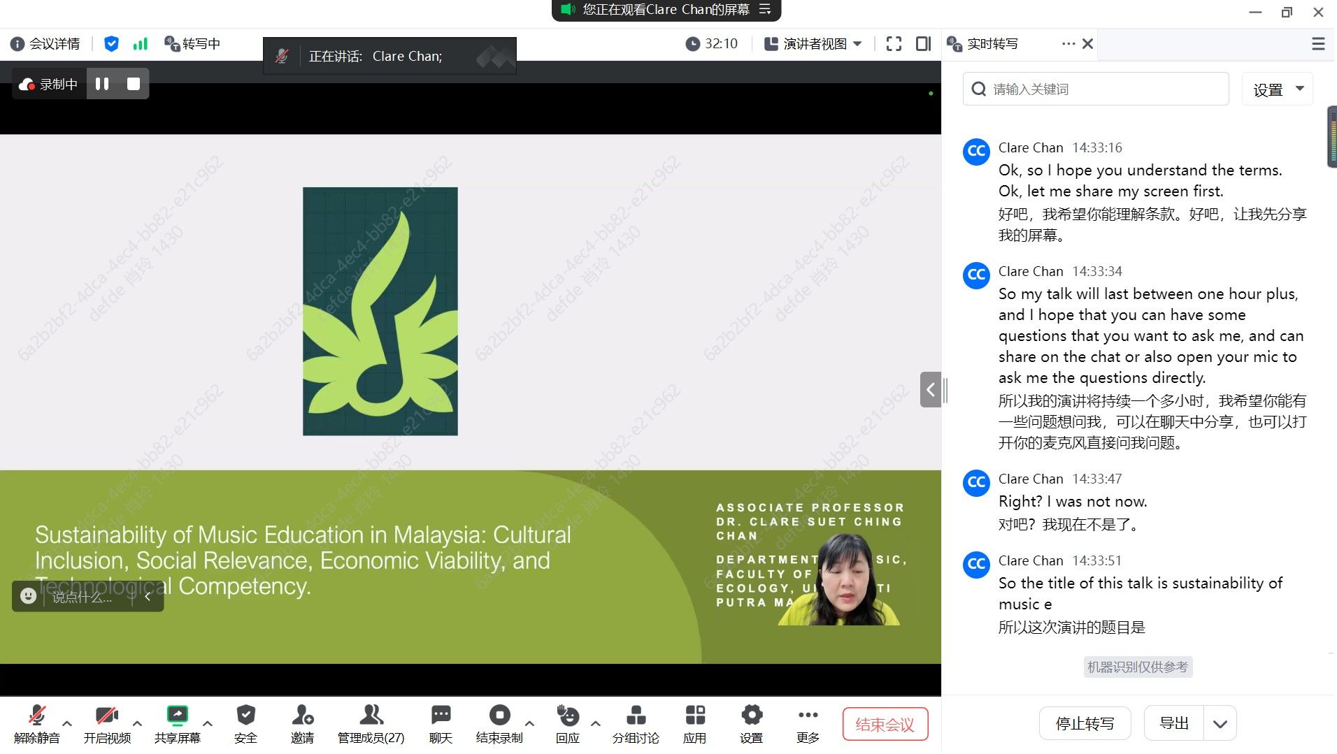 组织的全球前沿学科系列讲座(G-Seminar)“声音参数框架及AI歌手声音模型前沿研究成果交流”第6场活动,于2024年5月30日以线上会议方式进行,音乐系师生30余人参与。讲座采取中英双语方式,我院优秀校友、马来西亚博特拉大学博士候选人黄雪洁主持并担任翻译。