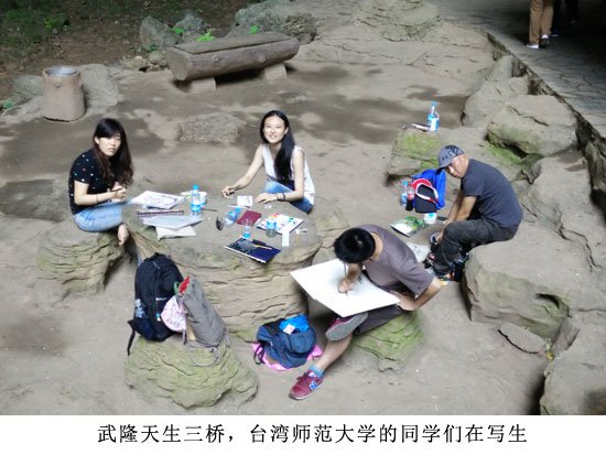 7月12日的清晨前往拥有喀斯特地貌的武隆。从仙女山、芙蓉洞到天生三桥参观游览写生。在天生三桥的那天是大家最出成绩的一天,天然的石桥,壁立千仞,飞泉流水,绿树成荫,三座石桥赫然立于峡谷之上。听完解说员简单的讲解之后,大家便各自寻点作画,静谧的自然风貌,给人一股来自远古的清幽与神秘感。水杉和柳杉夹杂着其他植物茂密的覆盖在我们必经的小路旁,天龙桥、青龙桥、黑龙桥,还有一池“碧玉”绿茵塘,沿着塘边行走便是一阵沁人心脾的凉意。黑天桥拱洞幽深,洞壁有常年不断流的雾泉,洞外艳阳四射,可这里温度却清爽宜人。大多数的同学都选择在这里写生,有在洞内画洞外的天生桥的,有的也会画这一线清泉的,那泉水从百米高的洞壁上一泻而下,散落在峡谷中,发出如珍珠散落盘中滴答声,这便拥有了一个美妙的名称“珍珠泉”。70多名参加采风写生的老师和同学,从不同的视角,采用不同的表现技法,利用不同的媒介展示着眼中独一无二的风景。有用丙烯、水彩颜料的,有用水墨的,也有通过素描、速写的形式表现的。形式多样,有的作品形式独特新颖,很值得大家互相探讨,交流学习,互换艺术创作理念,彼此拓展艺术视野。