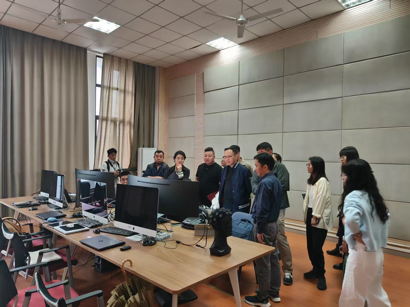 邓鑫一行首先实地参观了文创设计工作室、智能设计工作室、人因实验室等特色教学、科研场所。刘云国通过介绍学生设计作品、3D模型等,展示了学院师生在汽车造型设计、CMF、HMI交互设计、用户体验等方面的教学成果。长安汽车全球设计中心的专家对学院将艺术美学与工程技术融合的实践模式表示赞赏,并就设计流程优化、用户需求分析等话题与师生展开现场讨论。