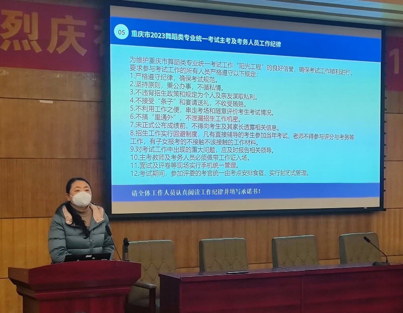 王琦带领大家详细的学习了重庆市2023年舞蹈类专业统一考试考务人员工作纪律,以维护重庆市舞蹈类专业统一考试工作“阳光工程”的良好信誉,确保考试工作顺利进行。