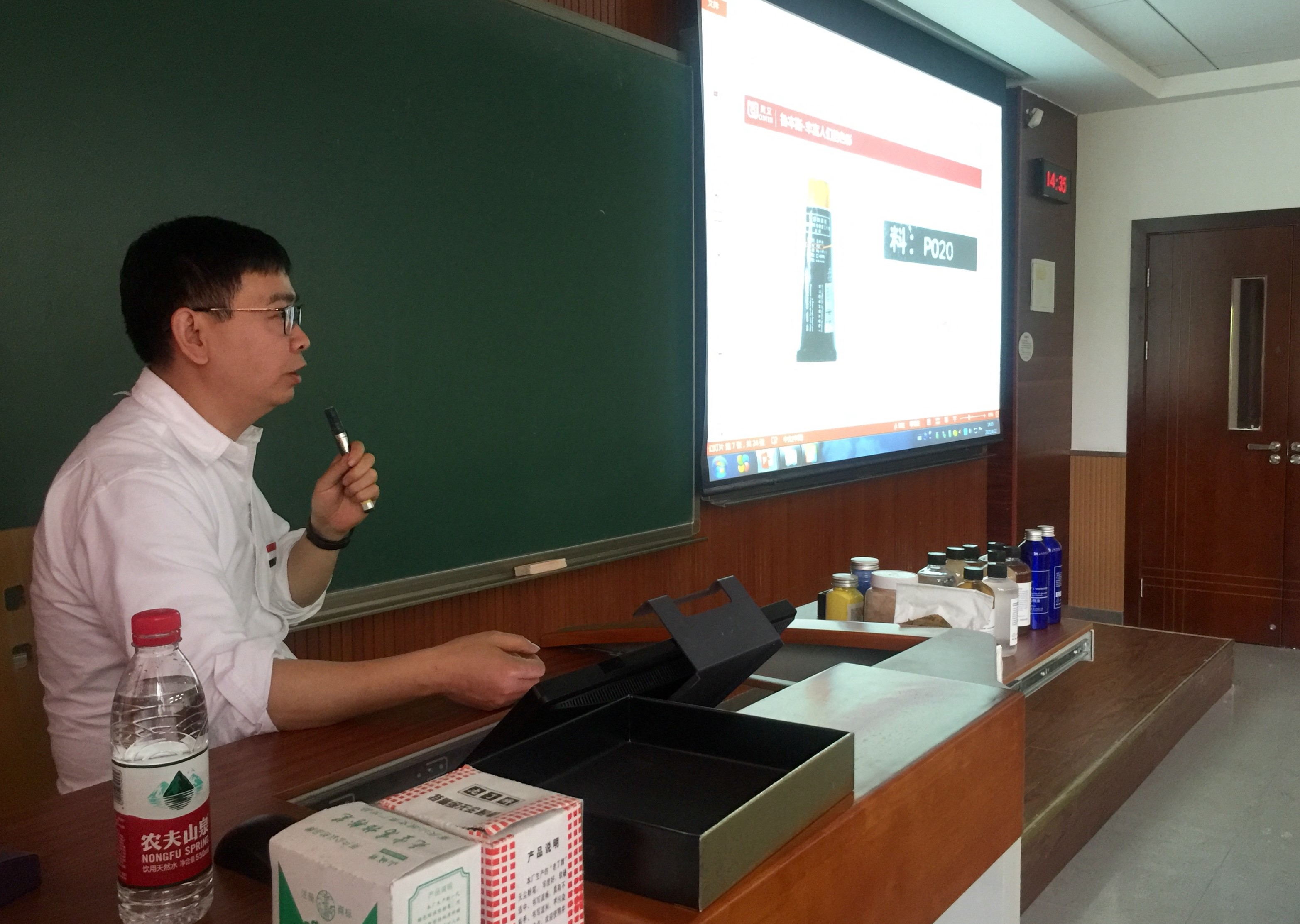 此次讲座时间长达4小时,游江海先生和随行人员带了很多大家熟悉的画材,有原材料类,颜料、色粉类,绘画媒介类,溶剂类等常见的各种品牌和类别的画材产品,分别向大家做颜料成份分析,绘画媒介种类介绍,绘画及材料运用原理等材料知识讲解;同时讲座中又与师生实验互动,从颜料的制作和辩识方法,颜料显色度测试,油画肥盖瘦原理分析,以及如何正确运用媒介等方面做了详细演示和说明。