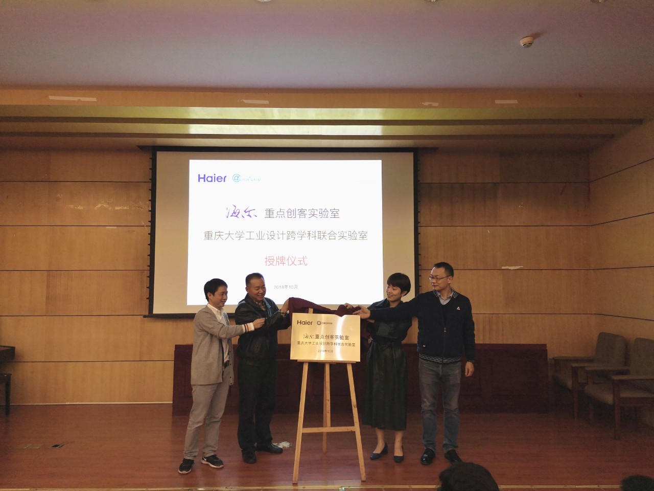 副院长龙红、院长助理夏进军、工业设计系主任刘云国、工业设计系副主任范正妍、以及海尔创客实验室导师曹席斌,海尔创客实验室项目负责人盛璐到场为海尔重点创客实验室揭牌。