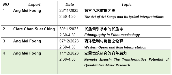 前四场的学术交流主要围绕德国艺术歌曲(Lieder)、法国艺术歌曲 (Mélodies) 以及马来西亚艺术歌曲 (The Malaysian Art Songs)及其解释,探索不同作曲家和时代的多样化风格的艺术歌曲,以及艺术歌曲的概述、演绎与诠释,声乐技巧与抒情的表达等。这个板块开拓了学生们的音乐产业视野。此外,讲座还引入了民族志的学科方法,从“观察与音乐性、本位与客位,道德伦理在民族志中的辩证探究”等方面进行分析,进一步明晰了民族音乐学中民族志考察的文化相对主义、参与观察、双音乐性、主位和伦理、“厚”和“薄”研究以及立场等概念。在量化研究单元,通过分享音乐量化研究典型案例,师生们了解了音乐定量研究的变革潜力与研究创造力。