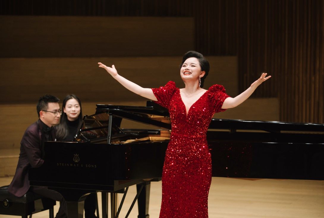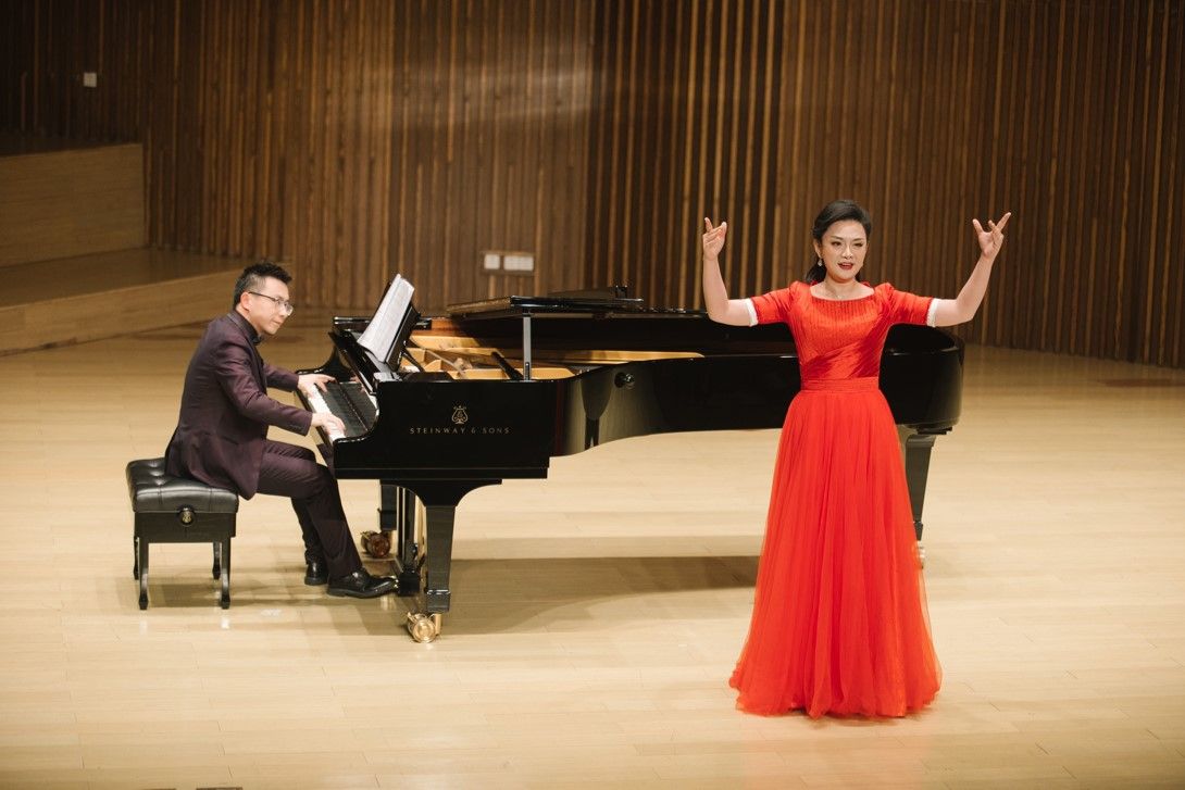 音乐系青年声乐教师袁筱璇共同为观众带来了中国古诗词作品《蝶恋花》和我国民族歌剧选段《月亮,快快升起》。