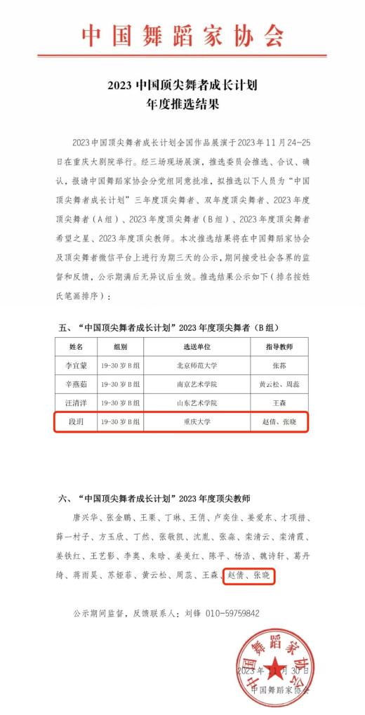 舞蹈系青年教师段玥荣获“中国顶尖舞者成长计划”2023年度顶尖舞者,舞蹈系主任赵倩、副主任张晓荣获2023年度顶尖教师。