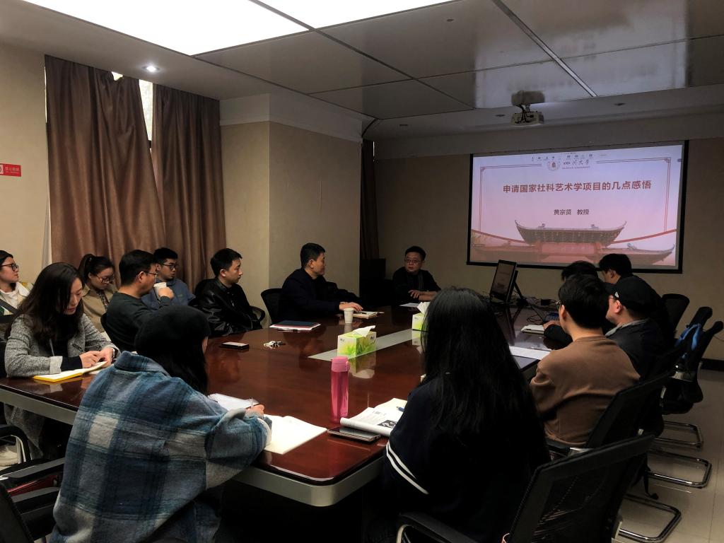 受疫情影响,张凌浩教授与甘锋教授分别于3月6日及3月7日在线上对我院教师的申报书进行审阅和指导,从选题、文献评述、学术价值、创新点、研究内容、研究方法等角度逐一点评并提出针对性修改意见,对我院师生的研究与论证思路带来很大启发。黄宗贤教授于2022年3月7日下午15:30莅临我院,在417会议室为课题申报教师分享《申请国家社科艺术学项目的几点感悟》,从“粮草先行——提前贮备课题资源、思问之道——追问选题的价值、洪荒之力——劳心费神撰写论证书、细节决定成败——吹毛求疵提升颜值、坚持就是胜利——屡战屡败屡败屡战”五个方面分享了自己近年来对国家社科基金申报及评审的经验,与大家深入交流互动,并针对老师的申报文本提出具体要求及建议。
