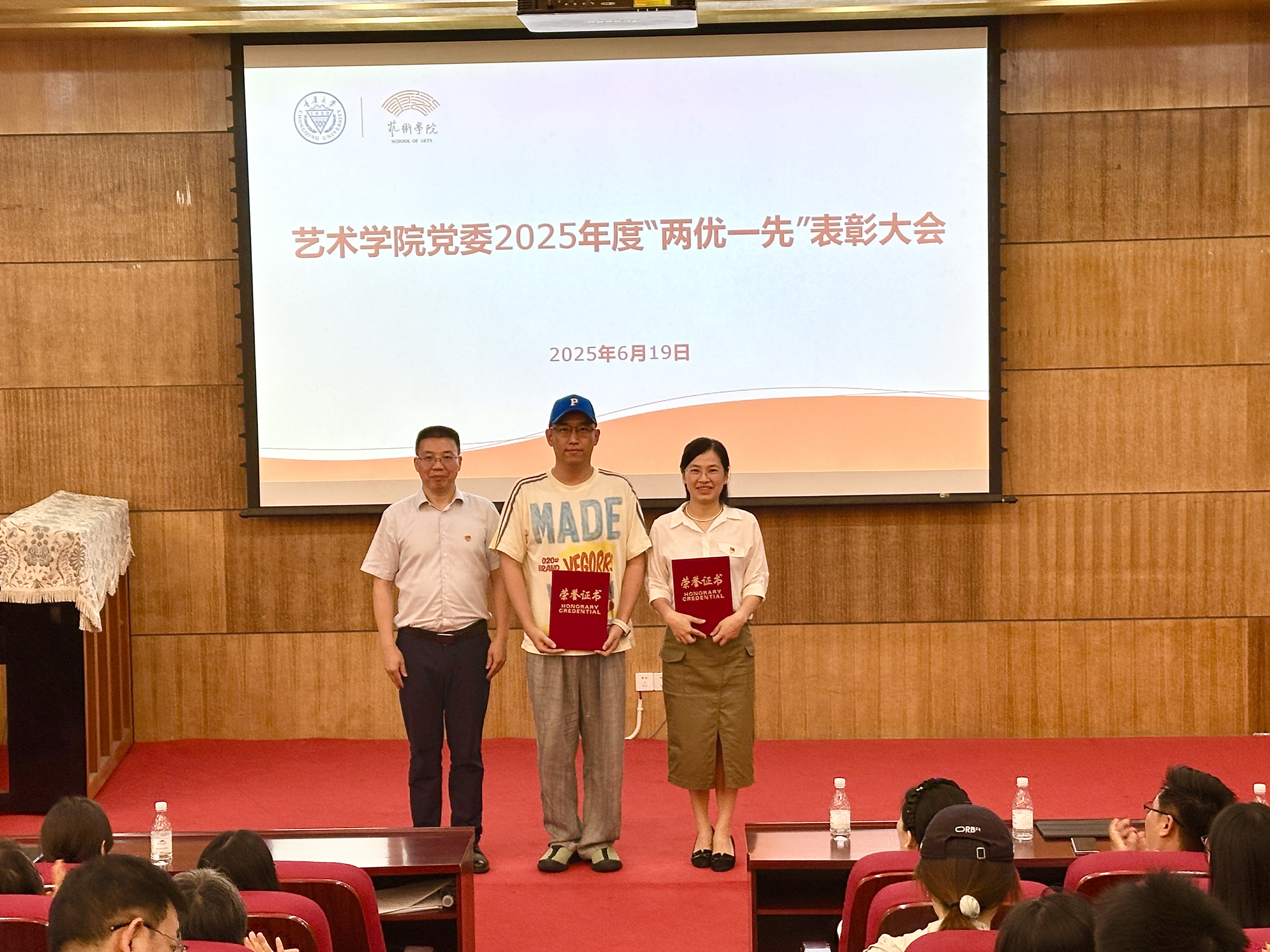 随后举行的是学院党委2025年度“两优一先”表彰大会。为充分发挥先进典型表率示范作用,激励广大党员和党支部奋发进取、创先争优,根据学校党委有关工作安排,学院党委开展了“两优一先”表彰工作,曲卫红等24名党员被评为学院优秀共产党员,罗筱婧等3名党员被评为学院优秀党务工作者,舞蹈系教师党支部和本科生第一党支部被评为学院先进基层党组织。蒋华林宣读表彰决定。蒋华林、彭小希和党委委员曲卫红、彭科星为获奖人员颁发证书。
