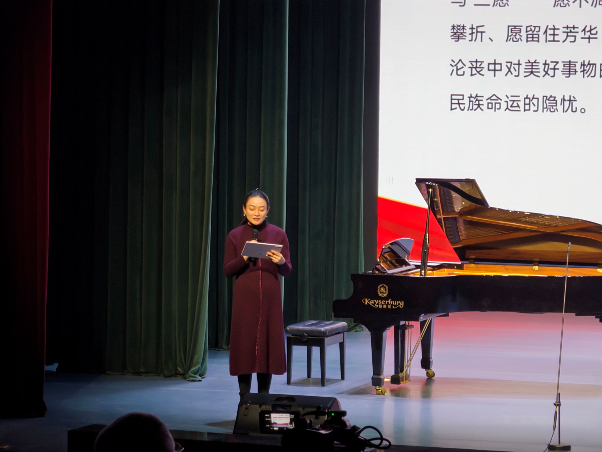 音乐系主任喻思言统筹策划,音乐系党支部副书记、声乐教师袁筱璇担任声乐指导与分享人,音乐系钢琴教师周珏担任钢琴艺术指导。音乐会以刘雪庵《长城谣》为线索,循着抗战大后方的文化脉络展开,以“讲述+演唱”的形式串联历史、融通艺术。袁筱璇在曲目介绍中从时代背景、作曲语言、人物情感切入,引导观众在音乐之美中聆听时代回声,让每一首作品既是歌曲,更是一段被重新点亮的记忆。