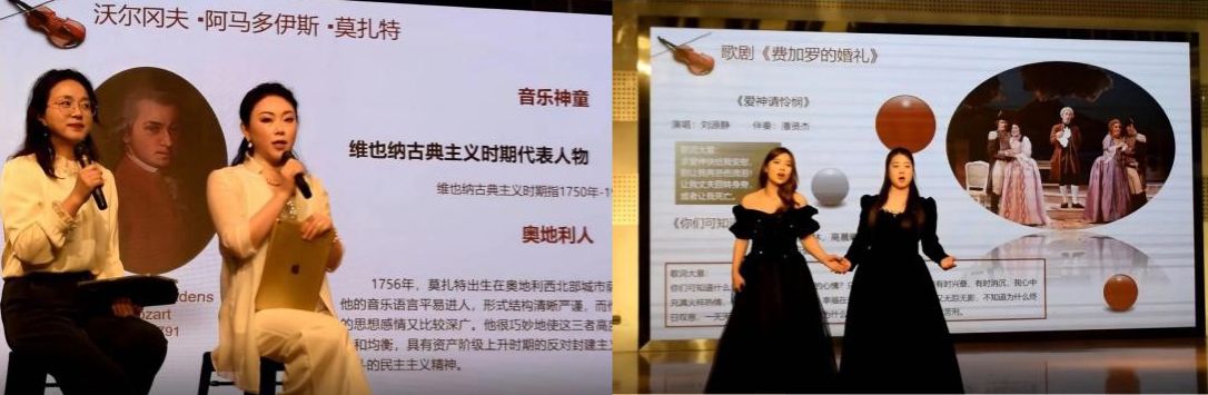 本次沙龙音乐会在开场曲《渴望春天》欢快简约的旋律中拉开序幕。音乐系尹恒、苏勤两位老师用专业而诙谐的语言,向大家介绍了莫扎特的生平及音乐风格,然后对开场的两首经典艺术歌曲《亲切的平静》与《我去向何方》进行了详细地讲解。音乐系师生在演唱过程中表现出良好的专业素养和演唱技艺,将莫扎特作品独特的艺术歌曲音乐风格和深邃的内涵传达给了现场观众。