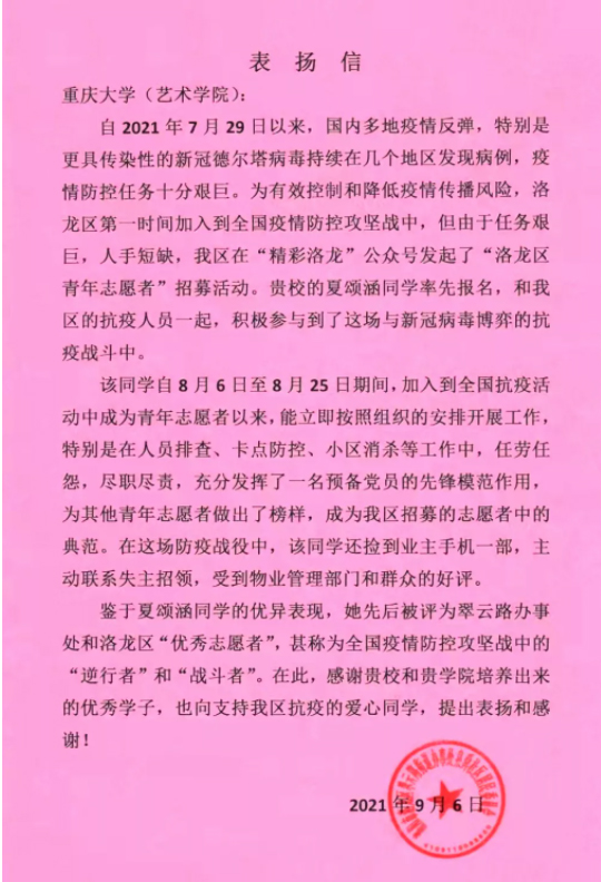 9月16日,色情影片 收到一封特殊的来信。这封信来自洛阳市洛龙区翠云路街道办事处,是一份表扬信。表扬的是色情影片 大二的学生夏颂涵。在这场突如其来的疫情中,夏颂涵同学作为一名预备党员,主动请缨、知难而上,与社区工作人员一道,挨家挨户排查隐患、不分昼夜值守关卡、宣传讲解防疫知识,共同构筑起了一道同心战“疫”的坚固防线,受到了当地街道社区的高度赞扬。“该同学自8月6日至8月25日期间,加入到全国抗疫活动中成为...